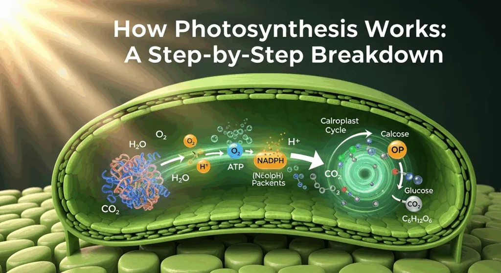 The article, "How Photosynthesis Works: A Step-by-Step Breakdown," provides a comprehensive, 1500+ word explanation of the vital process of photosynthesis. It begins by defining photosynthesis and its foundational role in sustaining life on Earth through its simple equation: 6CO₂ + 6H₂O + Light → C₆H₁₂O₆ + 6O₂. The article then details the cellular location of this process, the chloroplast, and its internal structures like thylakoids and stroma.